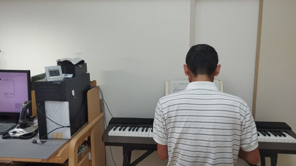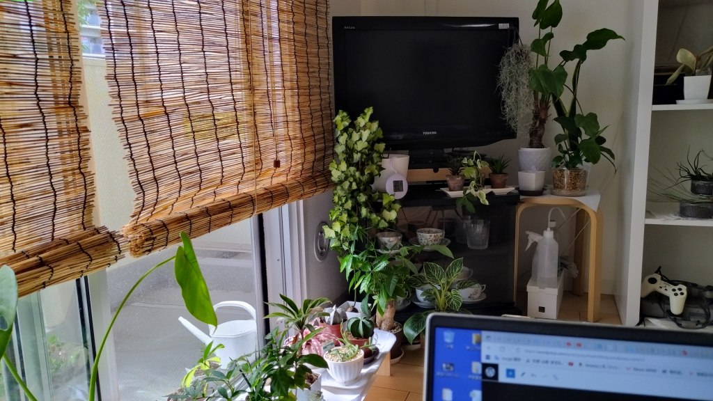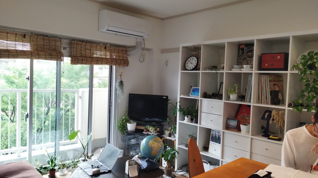 私の定位置は地球儀の横にあるパソコンの前のこげ茶色のソファです