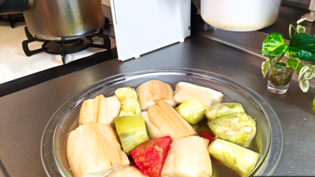 上の写真はナス、トマト、仙台麩をだし汁につけた所です