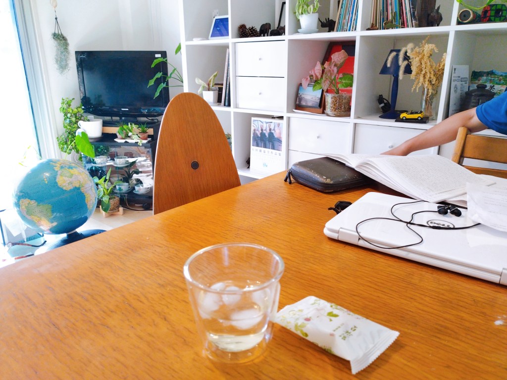 同じテーブルにいる息子は勉強中です